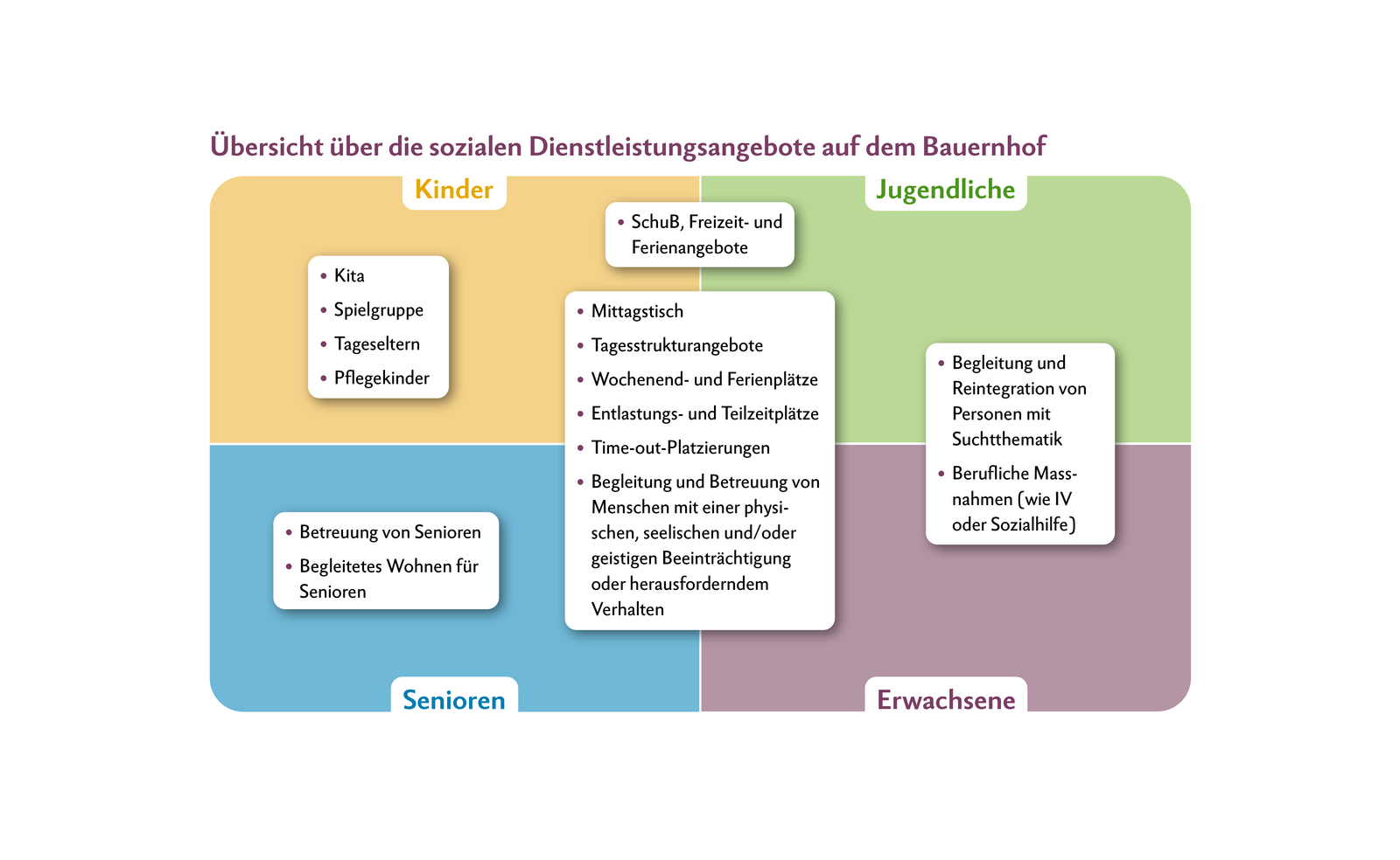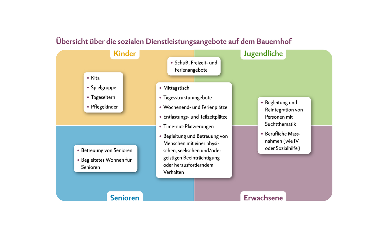 Corinne Hadorns Generationenprojekt ist ein Beispiel für Carefarming. Unter diesem Begriff werden Betreuungs-, Bildungs- und Therapieangebote innerhalb der Landwirtschaft zusammengefasst. Sie nutzen, was Bauernhöfe Kostbares zu bieten haben: strukturierte Tage, sinnstiftende Arbeiten, Nähe zu Natur und Tieren, die Integration in eine Lebensgemeinschaft – das alles tut Menschen gut. [REL 1] Die Angebote: Von der…