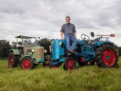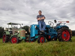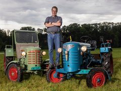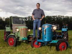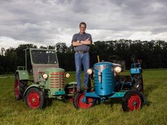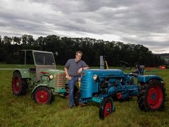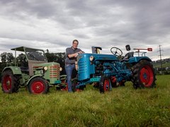 Dominik Laube (26), Lokführer/Feuerwehrmann bei der SBB aus Lengnau AG: «Landwirtschaft ist eines meiner vielen Hobbies. Ich setze die Traktoren hauptsächlich für leichte Arbeiten wie Holz- und Tiertransporte ein, mache mit ihnen Ausfahrten oder gehe an ein Oldtimertreffen. Der blaue Alpina Oekonom LD1 der erste eigene Traktor, den ich mit einem Kollegen restauriert habe.