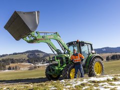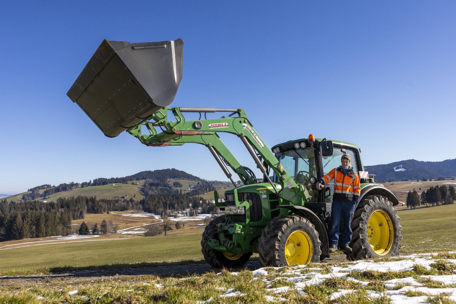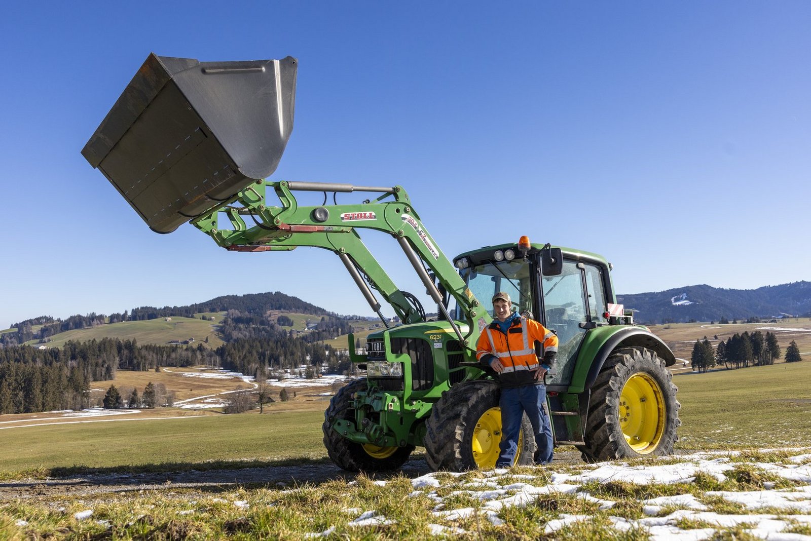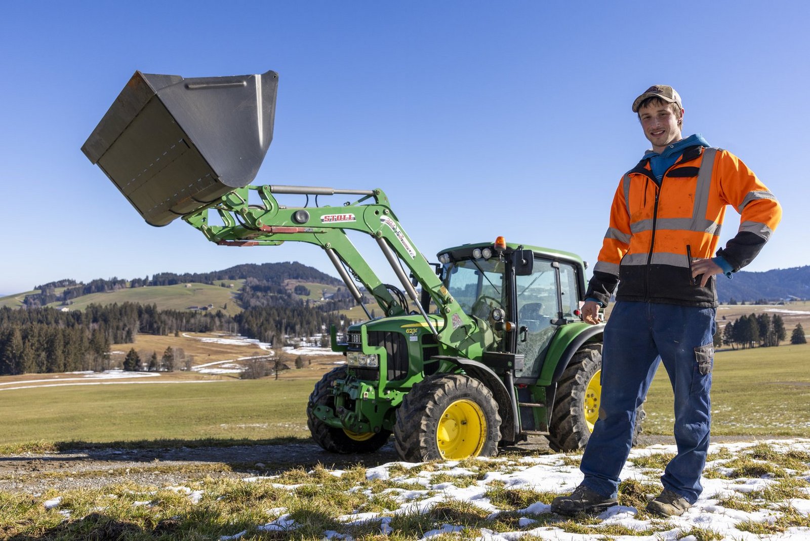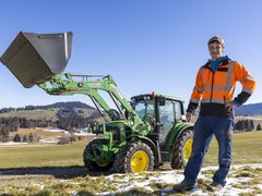 Tobias Kälin, Landwirt aus Bennau SZ, schwärmt von seinem Traumtraktor, dem John Deere. Für den Betrieb, den er mit seinem Vater führt, hat der Traktor die ideale Grösse.