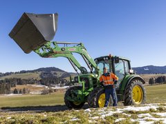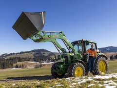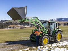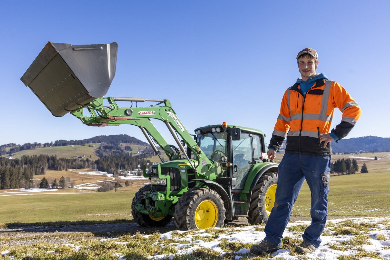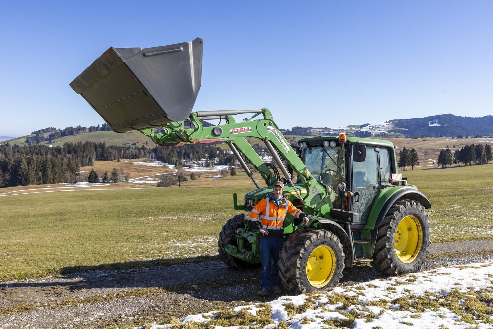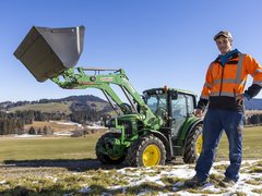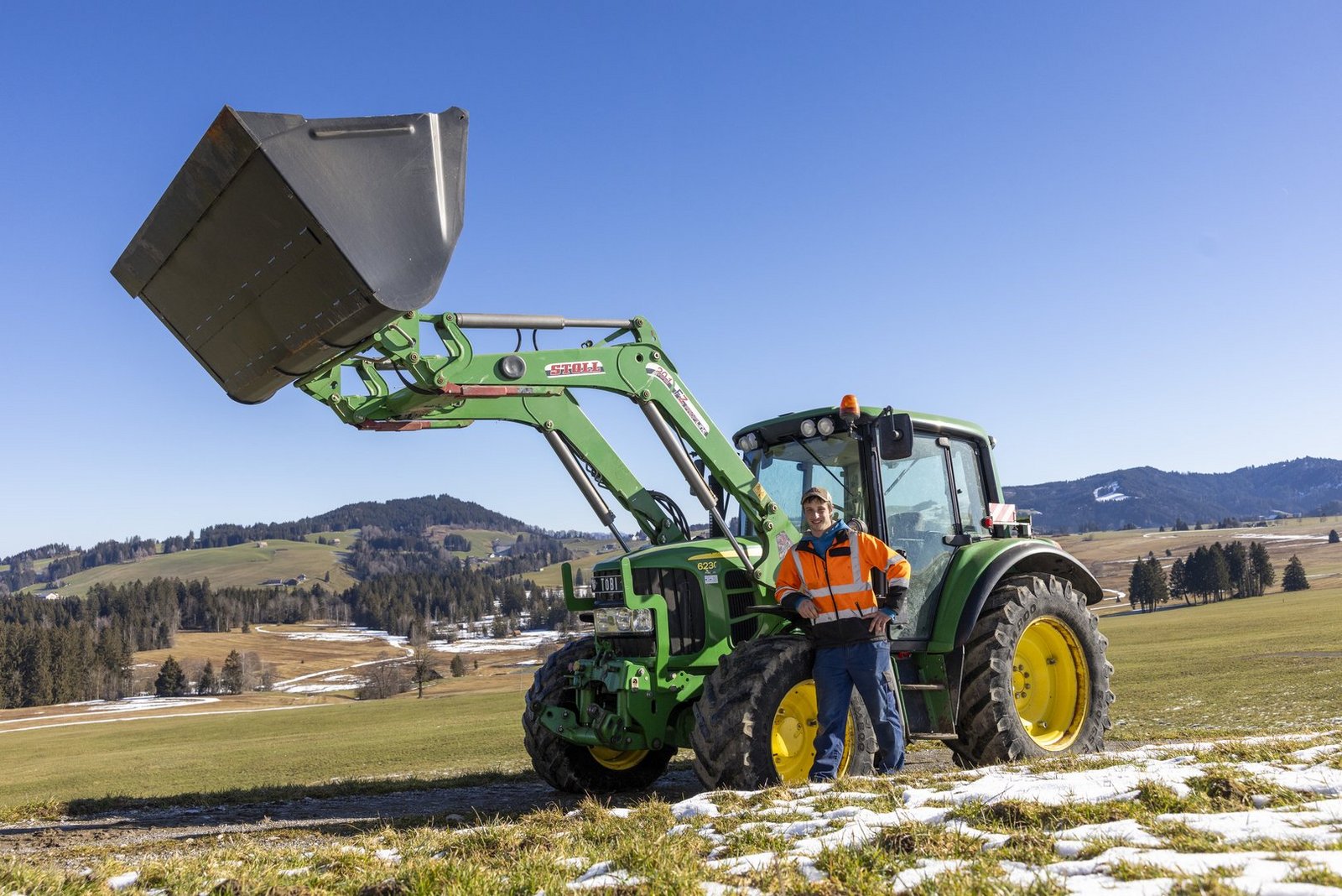 Tobias Kälin, Landwirt aus Bennau SZ, schwärmt von seinem Traumtraktor, dem John Deere. Für den Betrieb, den er mit seinem Vater führt, hat der Traktor die ideale Grösse.