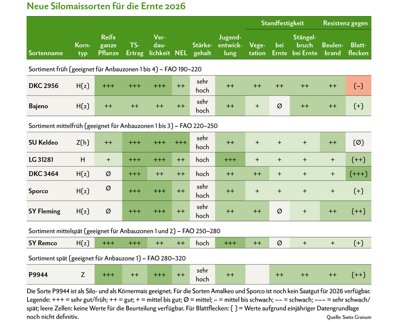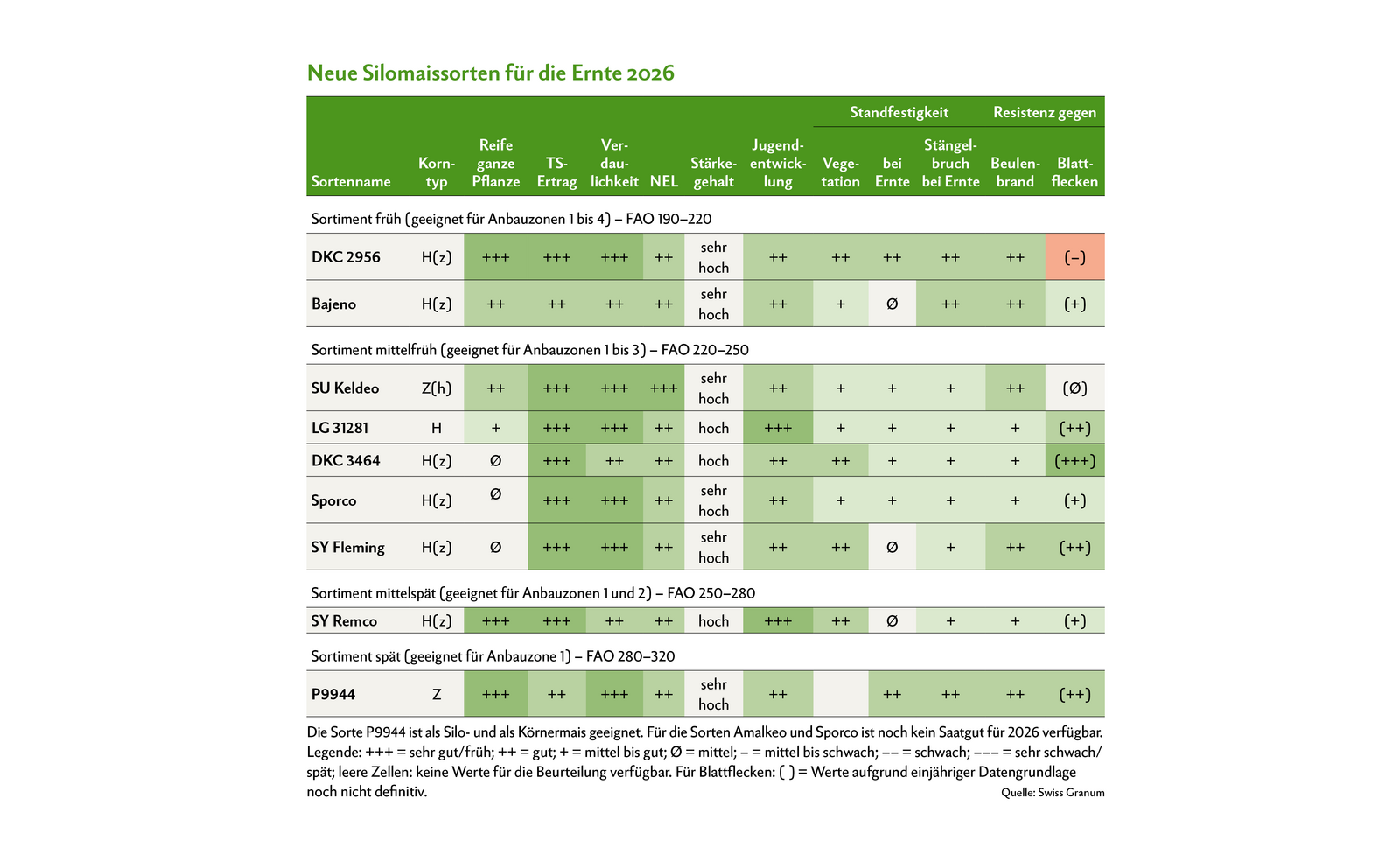 Auch beim Silomais gibt es neue Sorten. DKC 2956 (Bayer) zeigt in der frühen Reifegruppe hohes Ertragspotenzial und gute Verdaulichkeit. In der mittelfrühen Gruppe weist SY Fleming (Syngenta) eine stabile Standfestigkeit sowie solide Erträge auf. Alle neuen Sorten und ihre Eigenschaften sind in der Tabelle zusammengefasst.