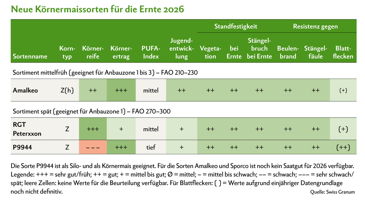 Unter den neuen Körnermaissorten ist Amalkeo (KWS) zu nennen: eine mittelfrühe Sorte mit hohem Kornertrag, stabiler Jugendentwicklung sowie guter Standfestigkeit. In der späten Reifegruppe gehört die Doppelnutzungssorte P9944 (Pioneer) zu den Sorten mit hohem Ertragspotenzial für Silo- und Körnermais. Eine vollständige Übersicht über die Neuaufnahmen findet sich in der Tabelle.
