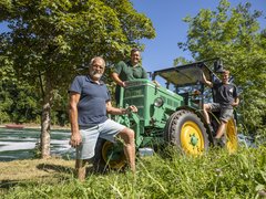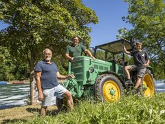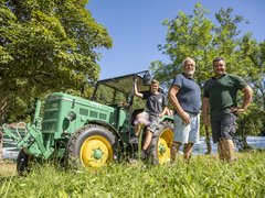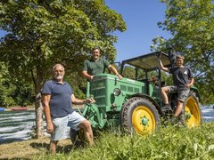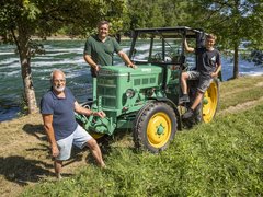 Der Bührer PF 21 begleitet Walter Studer (links) schon sein Leben lang und ist ihm ans Herz gewachsen. Mittlerweile gehört der Traktor seinem Sohn Sven (Mitte). Auch Enkel Sandro (rechts) hat Freude daran. Der Traktor wurde immer wieder angepasst, mit einer Sturzkabine, einem Hubkraftverstärker, einem hydraulischen Bremsventil, einer Fronthydraulik und einer hydrostatischen Lenkhilfe. Auch wurde die Spur auf 1,50 m erweitert.