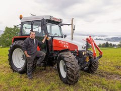 Der Steyr 975 ist ein idealer Mähtraktor durch die achsgeführte Fronthydraulik und der integrierter Entlastung. Eingesetzt wird der Traktor hauptsächlich am Mähwerk und beim Transport eines Vier-Tonnen-Baggers.»