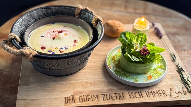 Irène Meier serviert in der fünften Folge der «SRF bi de Lüt – Landfrauenküche 2025» als Vorspeise eine Alösler Gruyère- Weinsuppe, Salat aus dem Brunnentrog, hausgemachtes Knusperbrötchen und Kräuterbutterkerze. Hier gibt es das Rezept für 4 Personen.